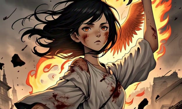 The Phoenix's Legacy In the heart of the mystical realm of Aethoria, where the sun dipped into the horizon and painted the sky with hues of crimson and gold, a young orphan named Aria stood atop a hill, her eyes fixed on the ancient ruins of the Phoenix Temple. The wind whispered secrets in her ear, and she felt an inexplicable connection to the mythical creature said to have once dwelled within those walls.