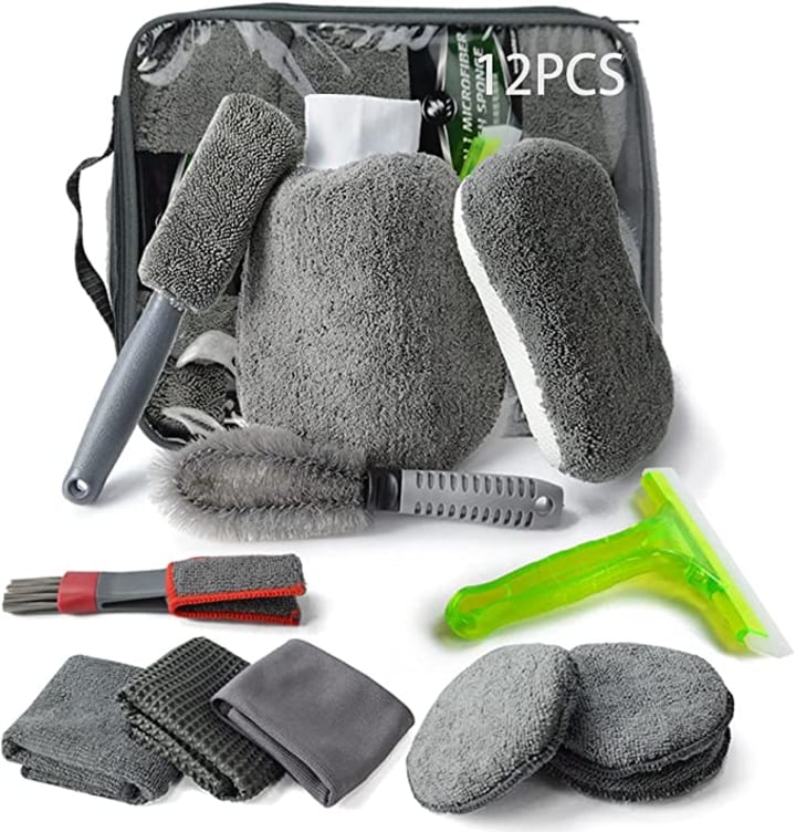 A car care kit or car cleaning set is a package of cleaning tools designed to make car cleaning easier and more effective. One such kit is the 12-piece professional car cleaning set. It includes a microfiber wash mitt, a high and low coarse mesh sponge block, a knitted towel, a glass cloth, a waffle grid, three towel cloth waxing pie, two car tire brushes, a ventilation slit brush, and a squeegee.