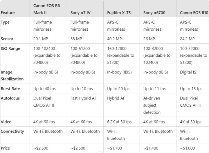 These cameras offer a variety of features and price points, ensuring that there is an option for every type of photographer. From high-end full-frame models to more budget-friendly APS-C cameras, each of these top 5 cameras in 2024 delivers outstanding performance and value.