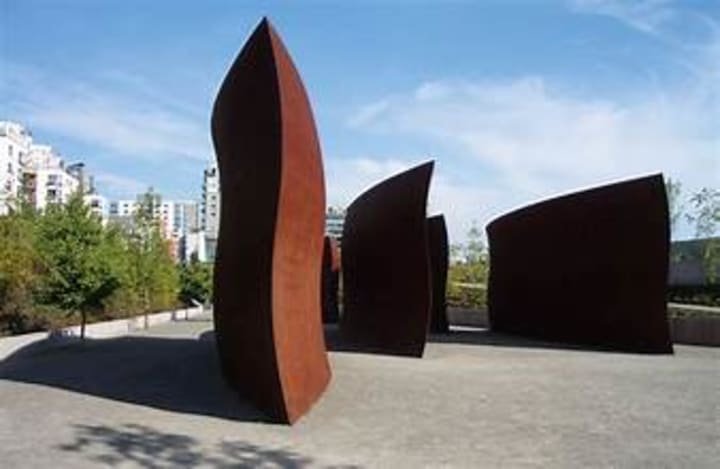 The first piece to be installed in this outdoor sculpture garden was Wake, a 300-ton steel Richard Serra artwork.