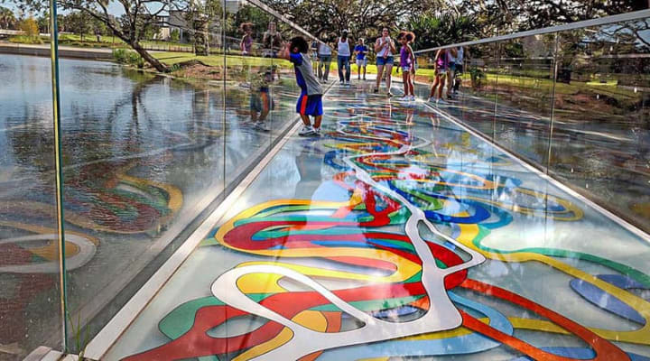You can cross over the water by the Mississippi Meanders by Elyn Zimmerman, a glass bridge. The colorful lines represent the changing course of the Mississippi River over the years.