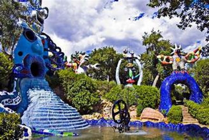 The Taro Garden in Capalbio, Italy, is the creation of French-American sculptor Niki de Saint Phalle and inspired by tarot cards. Other inspiration came from the Gardens of Bomarzo and Parc Güell. This was the first sculpture garden created by a woman. It features 22 sculptures.
