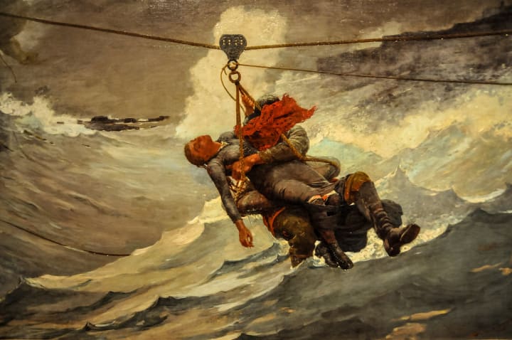 After Homer saw a demonstration of the use of a breeches buoy for sea rescues in Atlantic City, New Jersey he painted his popular painting The Life Line in 1884. Other paintings of sea rescues followed.