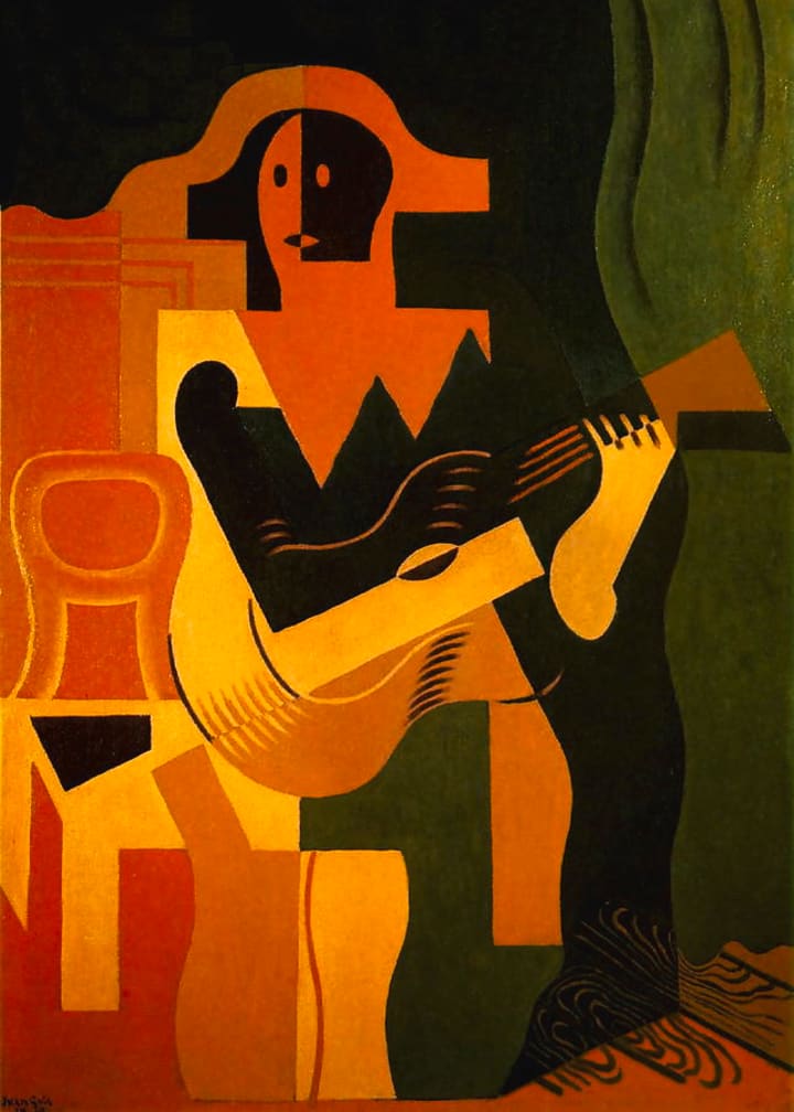 In 1917 it was Guitar and Music Paper. As usual with Gris the canvas shows a symphony of shapes and the guitar ready to sing a Cubist song. Looking long at this artwork, the viewer might begin hearing visual melodies.
