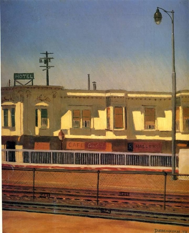 American artist Richard Diebenkorn helped shape the School of Abstract Expressionism in California with his artwork. This painting depicts an empty porch in a cityscape setting.