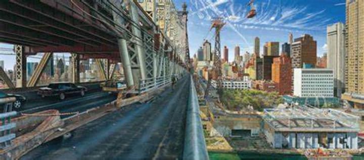 German Post-War anc Contemporary artist Andreas Orosz created this painting in Realism style of the Queensboro Bridge in New York City in 1999. The bridge connect the boroughs of Manhattan and Queens.