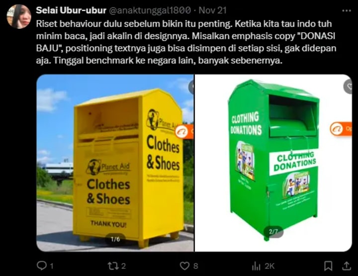 Behavioral insights from X user @anaktunggal1008 provide a compelling framework for improving the donation bin’s design. They suggest that visual and physical cues can clarify intended actions when users struggle with minimal reading comprehension.