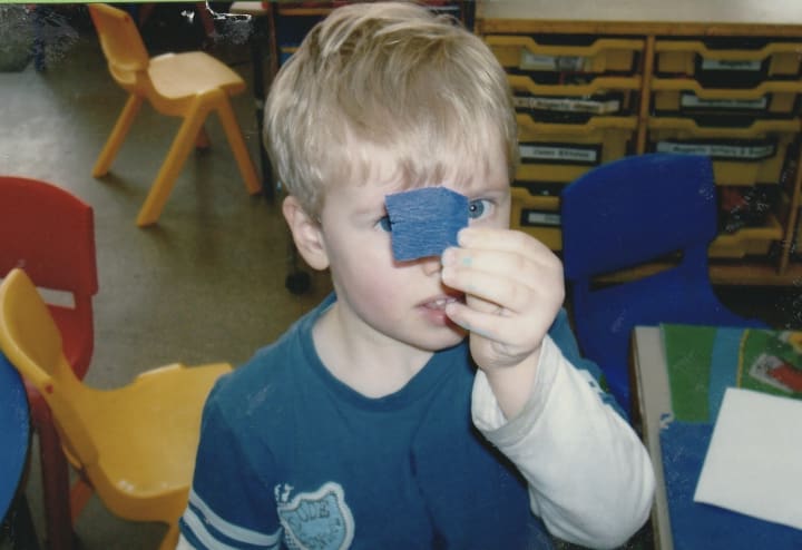 A 4-year-old Elijah McKenzie-Jackson at nursery in Walthamstow, London, proudly holding his favorite color during an arts and crafts session — dressed in blue and already showing early signs of creative expression.