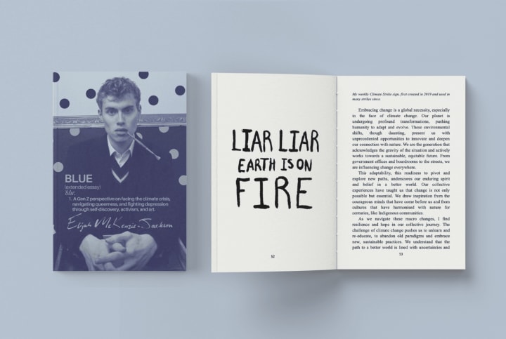 “There’s rage, obviously. But also grief, and softness. That’s what I try to capture,” Elijah says, flicking through a tattered sketchbook with ink-stained fingers. It’s this emotional honesty that powers Blue, his debut book — a genre-bending essay-manifesto-poem-visual journal hybrid that asks what it means to come of age in a world falling apart.