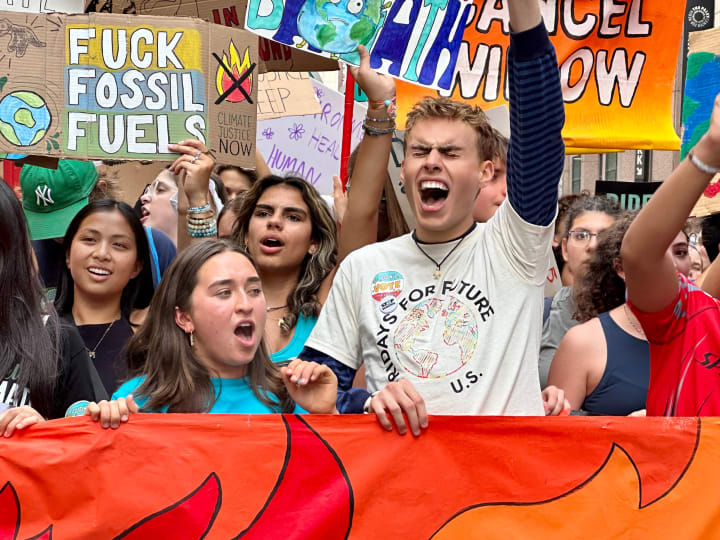 EElijah McKenzie-Jackson at a climate protest in New York City, wearing a Fridays for Future T-shirt with his fist raised in the air, standing alongside fellow youth campaigner and organizer Emma Buretta.