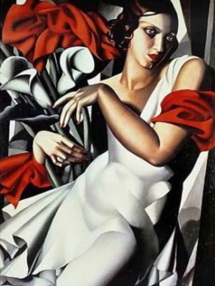Polish artist Tamara de Lempicka created this portrait of a close friend and lover, Ira Perrot. Her lover is seen wearing a white satin dress and leaning against the right edge of the painting. Ira is holding a bouquet of white lilies which are a symbol of purity and love. The contrast of light and shadow in her face reveal the influence of Cubism while the sensuality and high contrast colors and angular style reflect art deco.