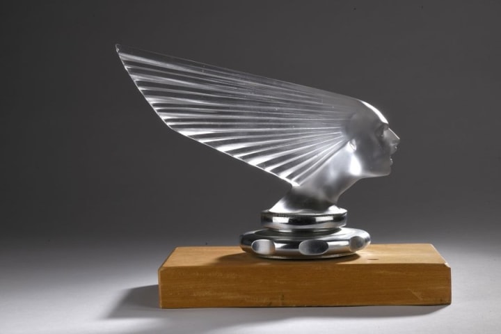 French designer Rene Lalique created Victoire as a car glass mascot. It represents a female facing a strong wind, her hair blown behind her resembles wings, and her face is jutting forward. This sculpture reflects the exciting sensation of speed. The use of glass reinforces this art object to be a decadent and rare purchase only the wealthy could afford.