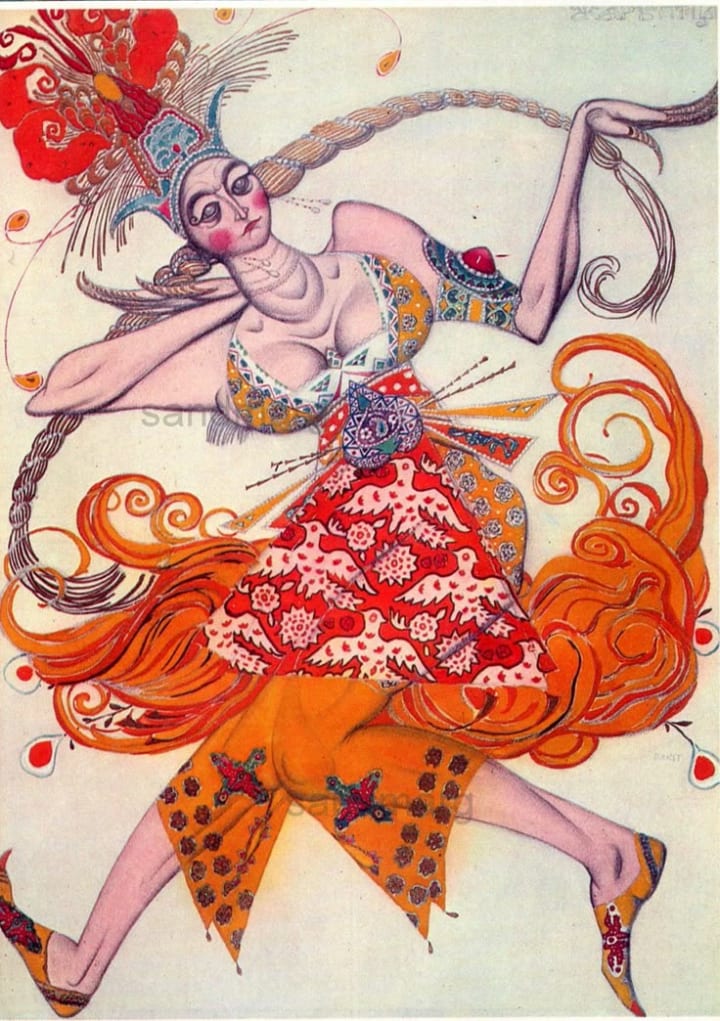 Russian artist Leon Baskt was one of the most important costume designs of the first decades of the 1900s. This is the costume design for the ballet Firebird represented in vibrant colors. The geometric form, exotic imagery, and bold composition are all elements of art deco. The artwork shows a female dancer in a yellow costume with decorative motifs and stylized figures like birds and flowers.