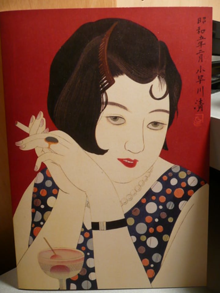 Japanese artist Kobayakawa Kiyoshi depicts a modern woman with red lipstick, tipsy eyes, holding a cigarette and a cocktail in front of her. This painting shows the lifestyle of an