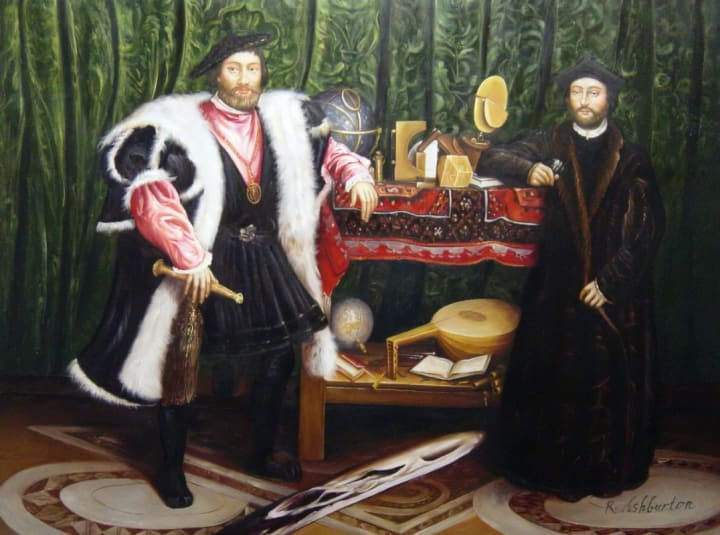 British artist Hans Holbein the Younger created this artwork in 1533 the same year that Elizabeth I was born, during the Tudor period. The ambassadors in the painting are Jean de Dinteville and Georges de Selve. It can be viewed at the National Gallery in London.
