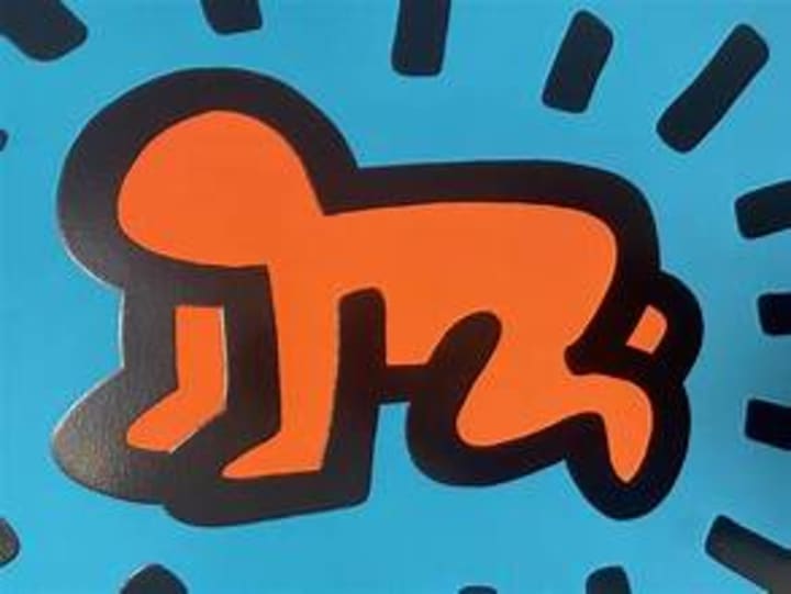 This is an iconic pop art piece depicting a bright orange baby with a black outline crawling on their hands and knees. The artist said the baby represented youthful innocence and the black line radiating from the baby convey a sense of life and energy.
