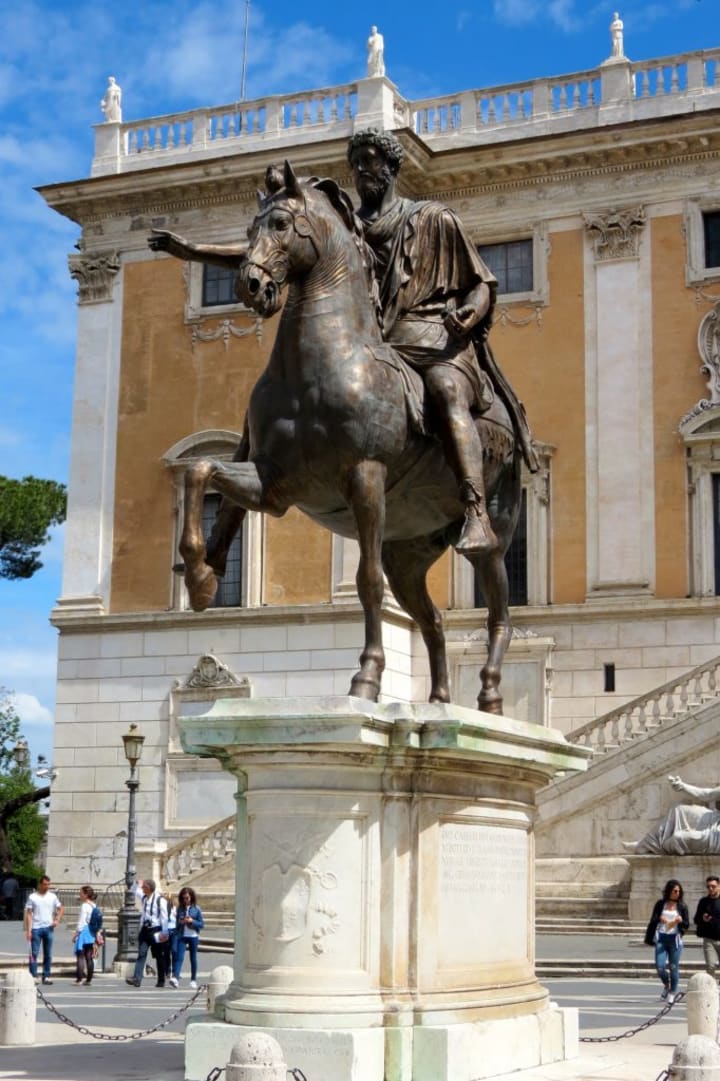 The Equestrian Statue of Marcus Aurelius is an amazing Roman sculpture located in Rome, Italy. It depicts the Roman emperor Marcus Aurelius on a horse in a pose addressing his troops. The saddle cloth on the horse was copied as part of the standard Roman uniform but is of Sarmatian origin, This suggests that the statue was created to honor Marcus Aurelius' victory over the Sarmatians.
