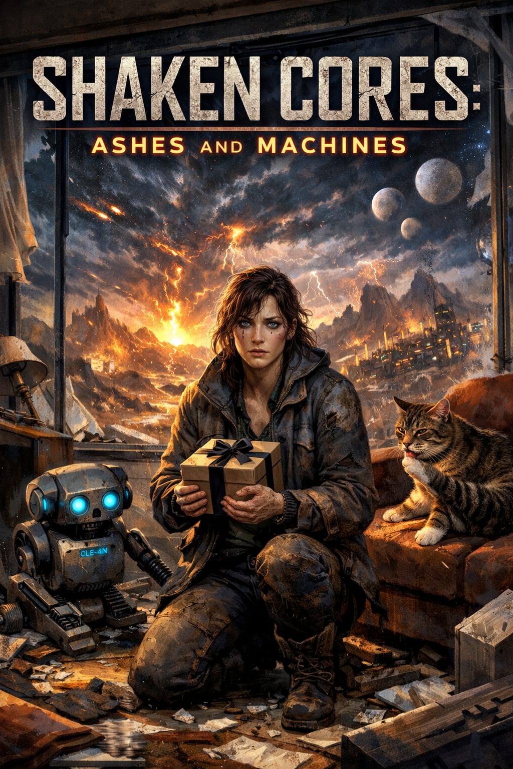 Frames dangled, skewed or shattered. A lamp lay in shards. Vases toppled, their contents strewn across the carpet. CLE-4N, her cleaning bot, skittered across the debris, whirring desperately. Another tremor rocked the room. Syra dove beneath the steel-framed table, curling into herself, as the quake raged on. Minutes stretched like hours—crash, crack, rumble, roar—until silence fell.