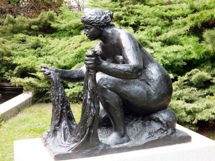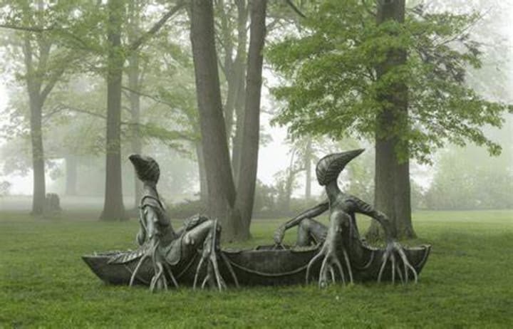 In Two Canoe Wangechi Mutu, 2022 is a sculptural fountain with two figures becoming one with their vessel.