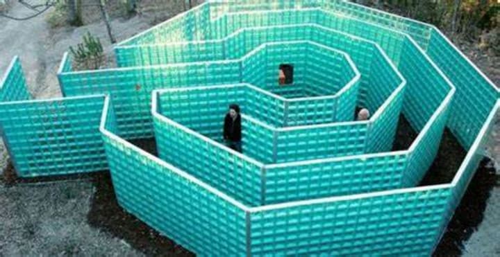 Glass Labyrinth Jeff Saward is an arrangement of green glass walls that visitors can walk through.