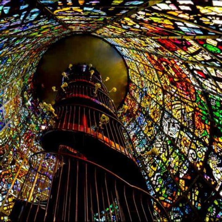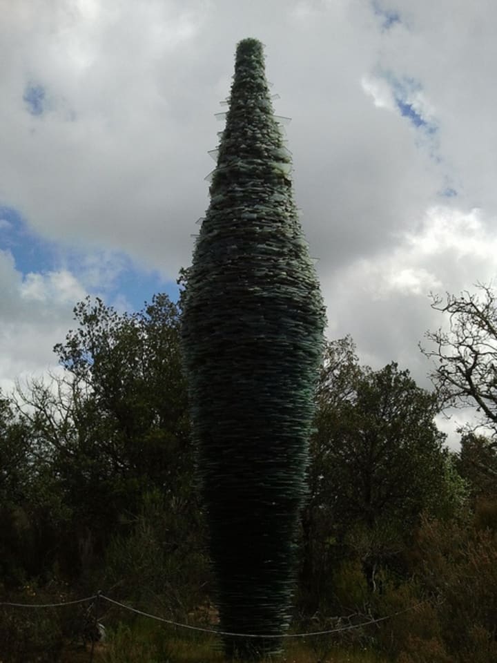 This artwork is a steel and stained glass tower with a spiral staircase in the center that can be climbed.