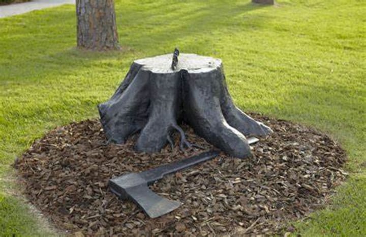 The Labors of Alexander is a surrealist sculpture by Rene Magritte. A bronze tree stump with roots that appear to hold an axe to the ground.