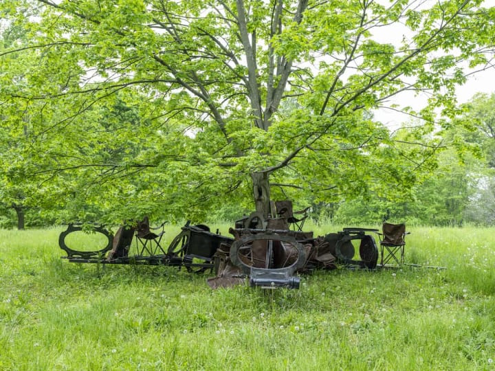 Shade Tree Brandon Ndife 2022 is a sculpture embedded with household items beneath a tree