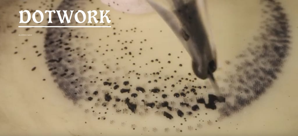 I sketch the outline with small dots to prevent the stencil from smudging. In my opinion, dot work is a fantastic technique to start with in tattooing. It's relatively quick to learn and still allows you to create beautiful tattoos. Once I've fixed the outline with dark dots, I work on the next circle with the second lightest gray tone.