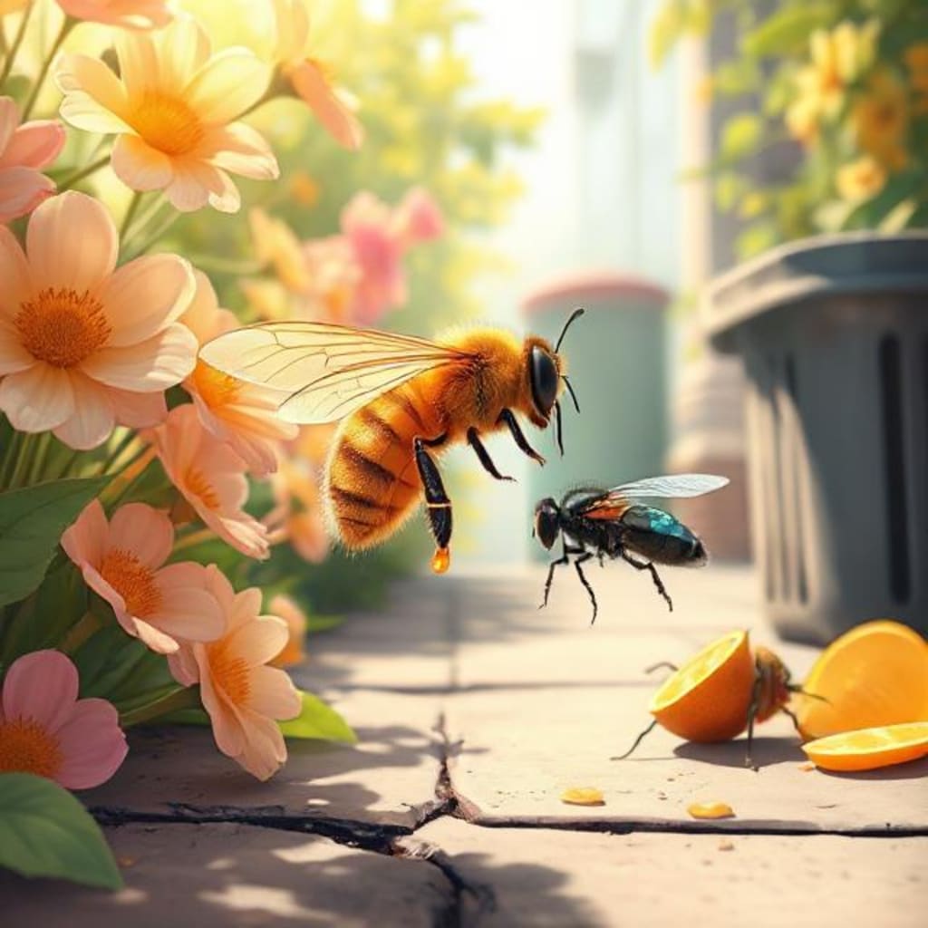 One day, as Bella flew from one vibrant daisy to another, she heard a strange sound—a buzz that was not as melodic or graceful as her own. It was a bit more erratic, and there was something… different about it. Curious, Bella flew toward the sound and found herself hovering near a small, unkempt creature with dark, iridescent wings. It was a fly.