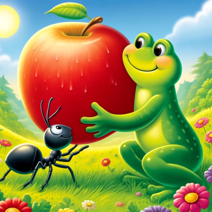 One sunny morning, the frog noticed the ant struggling to push a giant apple across a grassy hill. The apple was far too big for the tiny ant to manage alone.