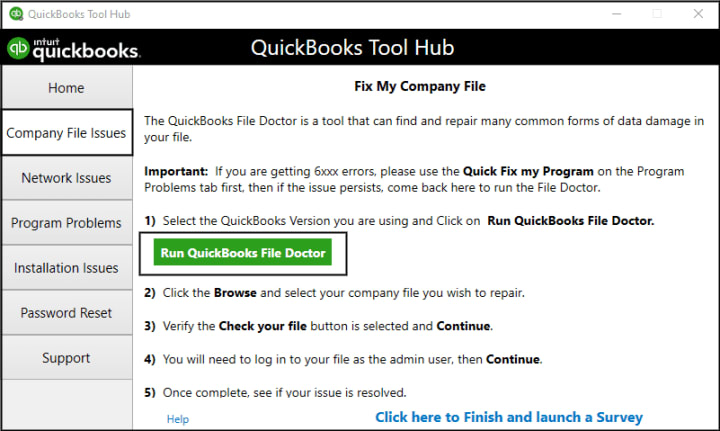 - Download and launch the QuickBooks File Doctor tool from the official QuickBooks website.
