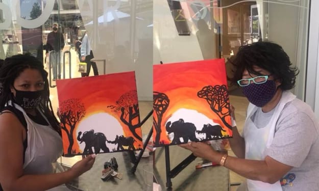 My daughter invited me to a Paint and Sip brunch as my Mother's Day gift. This is the first time I had been to such an event. I have been seeing posts on Facebook for several years of couples who have gone to evening painting events but I never had an interest. I'm not much of a drinker so I did not understand why there was such a big deal about sipping a mimosa. I had one that was pineapple and mango and as usual, I did not feel a thing. I also had a large waffle with butter and syrup which was really delicious.