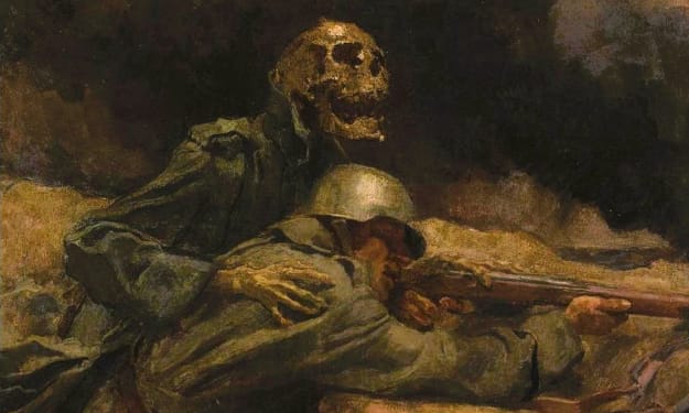 Behind the proud mask of heroism War is only the rotten maw of death Brooking no question or criticism From the lungs of the skeptic, it gulps breath