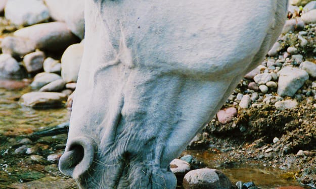 CONTROL The old gelding stands, legs spread as though at any moment gravity might win an eternal battle begun the moment a foal slips from the womb and, before its coat is even dry, unfolds its stilt-like legs to stand. A sound like wind through dried grass catches the horse's attention. Its ears swivel and the animal moves to the boy. The youth's scrawny arms strain as he places a heavy collar about the horse's neck. Hanging on one ear momentarily, the collar appears as a lopsided crown. A suitable symbol of the horse's servitude.