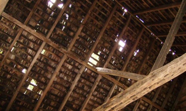 He stared up into the rafters of the old run-down barn, taking in the sight before him; With a sweeping glance across the sea of timber hues, his eyes were first drawn to a long, singular support beam running the horizontal width of the barn and seating itself firmly at the junction of the roof and the walls. A pale, crude piece of wood; with no sanding or dye or finish. Rough-hewn and irregularly shaped, it looked as though it had been carved by hand. Its surface was littered with holes and indents and chips – rather drill and saw marks, and cuts, for they were obviously man-made – on its' three observable sides for the entire length. Halfway across its length, in the middle of the barn, the convergence point just out of sight on the top face of the beam, were two more pale pieces of wood which stood out from the surrounding timber. Also pale and unfinished, though much more clean edged and faced than the aforementioned, also covered in man made protrusions into their surface from prior use, though only on two of their faces, they extended at 30 degree angles and attached themselves onto the lattice-work that supported the roof shingles from inside and underneath.