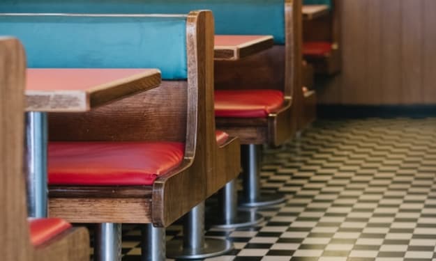 Rebecca found Sal’s Diner in much the same state she remembered leaving it. Cracked vinyl booths, dirty windows with handprints, and a chimney that sported a thick bib of creosote. A few patrons spun idly on vintage bar stools, while a stooped and aged fry cook stood next to a sizzling grill, his attention elsewhere. Rebecca strolled in and seated herself in a corner booth next to the dirtiest window she could find.