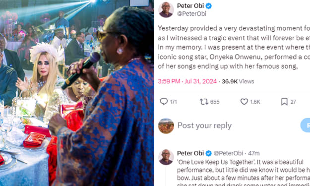 In the early hours of today, news broke about the death of Nigerian icon Onyeka Onwenu. What we knew at the time was that she died after performing at an event where politician Peter Obi was present. Because of this, people have been waiting to hear from the businessman on his account of what happened to give more clarity on what happened on that fateful evening. And now, Peter Obi is giving his own account of the evening. Here's what Peter Obi said about the final moments of Nigerian icon, Onyeka Onwenu.