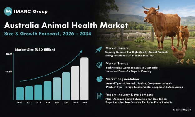 According to IMARC Group, the Australia animal health market reached USD 801.6 Million in 2025 and is projected to grow to USD 1,025.3 Million by 2034, exhibiting a compound annual growth rate (CAGR) of 2.69% during 2026–2034. This steady growth reflects the strategic importance of veterinary care, livestock productivity and biosecurity management across Australia. The animal health industry encompasses vaccines, pharmaceuticals, feed additives, diagnostics and veterinary services for both companion animals and livestock. As pet ownership rises and export-driven livestock industries expand, demand for preventive healthcare and advanced treatment solutions is strengthening nationwide.
