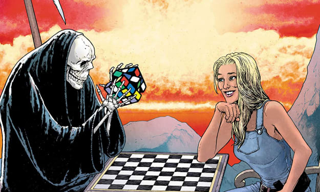 Death by Life #2 Antarctic Press 2021 Written by Anthony Zicari Illustrated by Claudio Sepúlveda Realising he has done something he should not have and that his body is changing as a result, Death tries to escape his reality. But his appointed overseer, the archangel Miridia, forces the truth out of him. Meanwhile, Death's situation has attracted the attention of others, including a seraph who comes to interrogate Deaths's little sister.