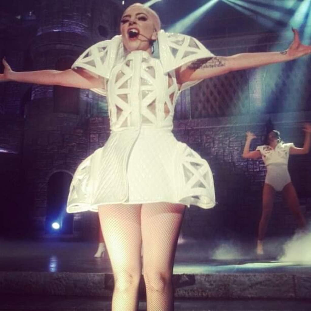 A jarring guitar riff careens through the speakers and the lighting shifts. The mood is electric and gritty. Gaga runs towards the center stage landing in a knee slide like a true rockstar.