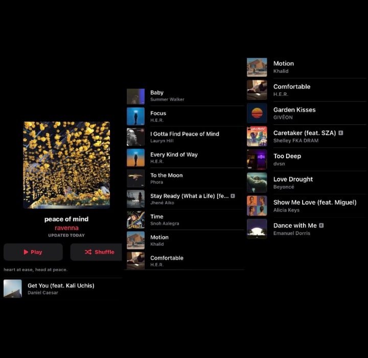 When I meditate to the songs in my ‘peace of mind’ playlist they all project the same frequency, putting me at ease. It prepares my mind, body and soul for the state of peace I’m about to enter. These songs guide me throughout my meditation and aid as a reminder that I need to release and stay in the present with the universe and myself.