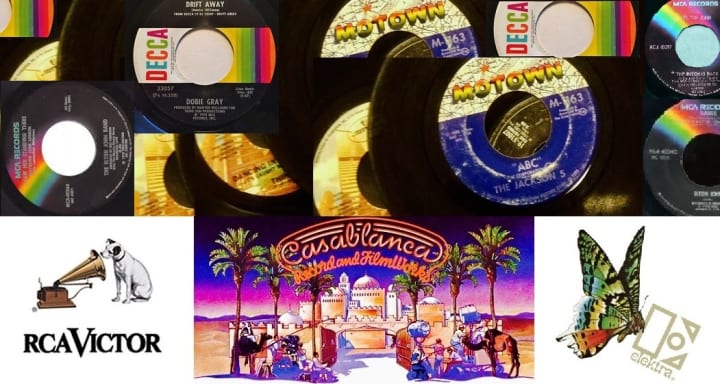 As I grew older, my focus gradually shifted to collecting vinyl records. During my early teenage years, I readily eschewed all things I thought of as “kid stuff” and began collecting my favorite radio hits on 7-inch 45 rpm. To this day I still associate many of my favorite artists with their related record company labels. Hearing Elvis Presley or Dolly Parton vividly recalls spending hours watching Nipper spin ‘round and ‘round, as well as the multi-colored butterfly perched upon the big "E" on the labels of my Carly Simon and Queen records. Just as I perpetually see the rainbow label spinning in my mind’s eye whenever I listen to Elton John, or the spectral colors and palm trees of Casablanca while listening to KISS' Destroyer or Donna Summer's Live and More or Bad Girls double albums.