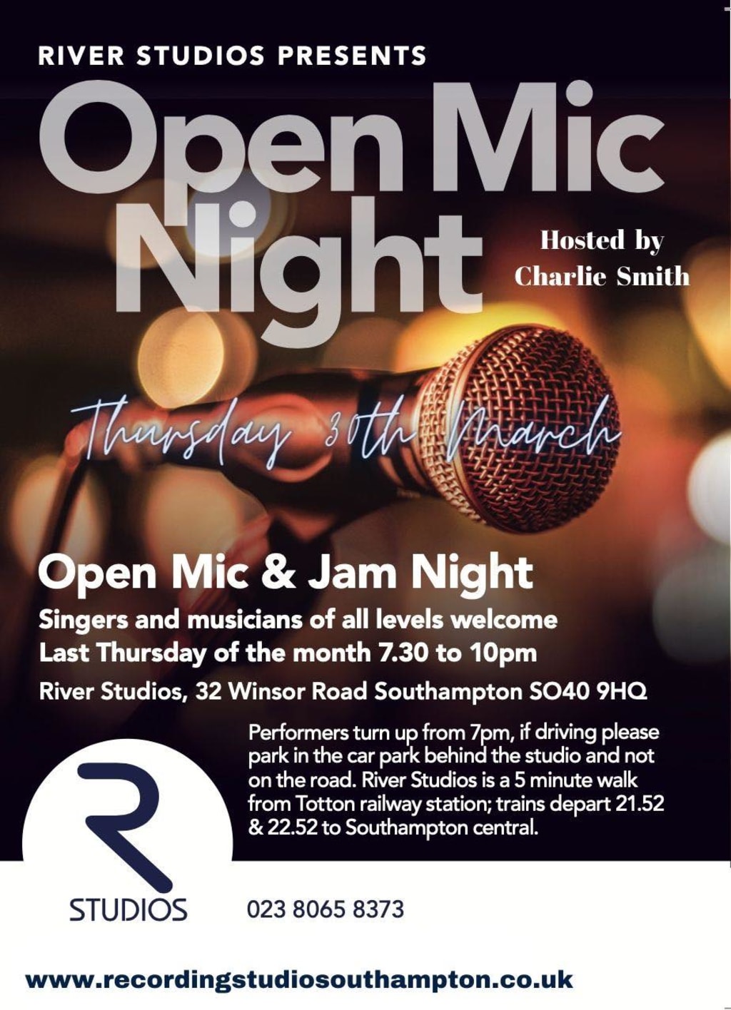 It's only me, Charlie Smith back again to do a little write-up about another open mic night at River Studios! Yes, another month has flown by and it's time to take a little recap. This month's article has been slightly delayed just because of how busy I have been in early April. I had the pleasure on Sunday the 2nd of April of hosting my first-ever gig outside of Southampton at the Rail Way Inn, Winchester. While I think it was a smashing gig I can't lie it has taken a lot out of me to put on the evening. I will have a full article coming out about that hopefully in the coming week. I also decided to have a break over the Easter period to try and relax somewhat. It's not always easy to switch off as an indie musician as there are always more gigs to play, practise to do and songs to write. Keeping on writing articles like this is also a challenge for me! Not really for any specific reason other than I am good at procrastinating. So now with having a few days off, I feel fresh and ready to get back to writing, music and gig planning. No maybe not quite fully refreshed, but it will do. I've still got a few chocolate eggs left to eat so that will give me a bit of energy to write the rest of this article.... I hope.