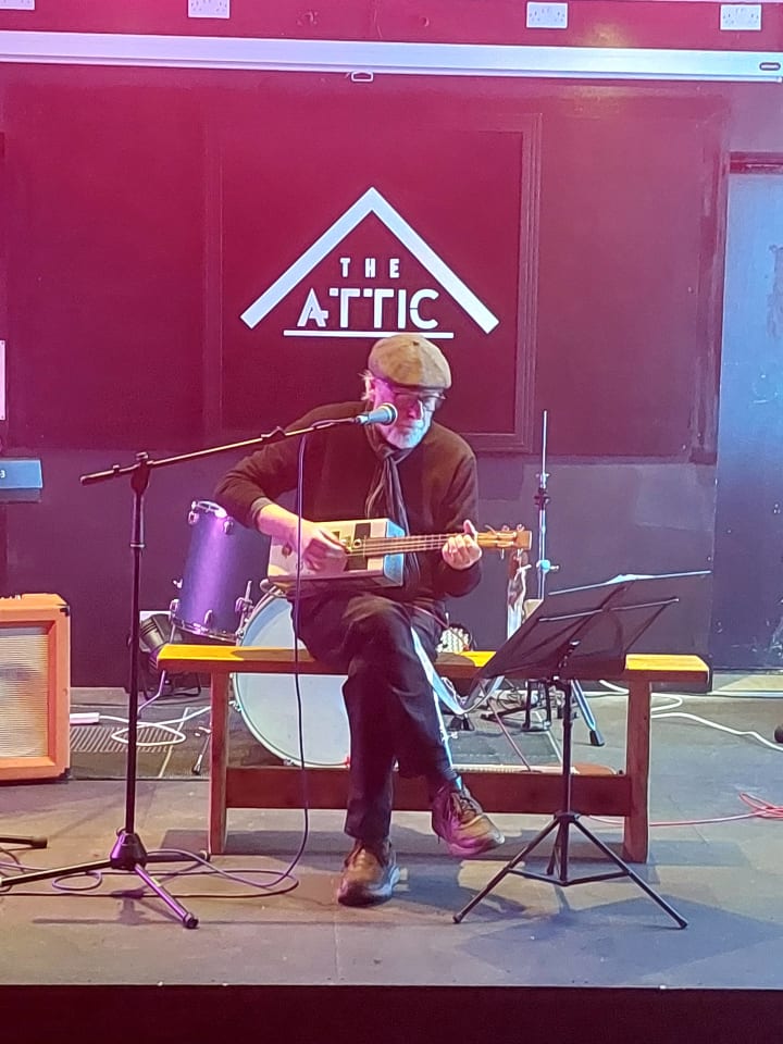 It is what you think it is! A cigar box ukulele. Have you ever seen one before? I never have. What a treat it was. Thanks, Julian for coming down and sharing some tunes with us. Always find it fascinating when you find new instruments and new genre styles at open mics.