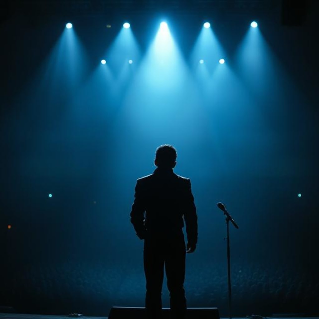 A cinematic portrait of Michael Jackson’s silhouette standing under a soft spotlight in an empty concert hall. Background is dark with a soft blue glow. No people, just his shadow and a mic stand. Dreamlike atmosphere, emotional lighting, surreal and respectful tone.