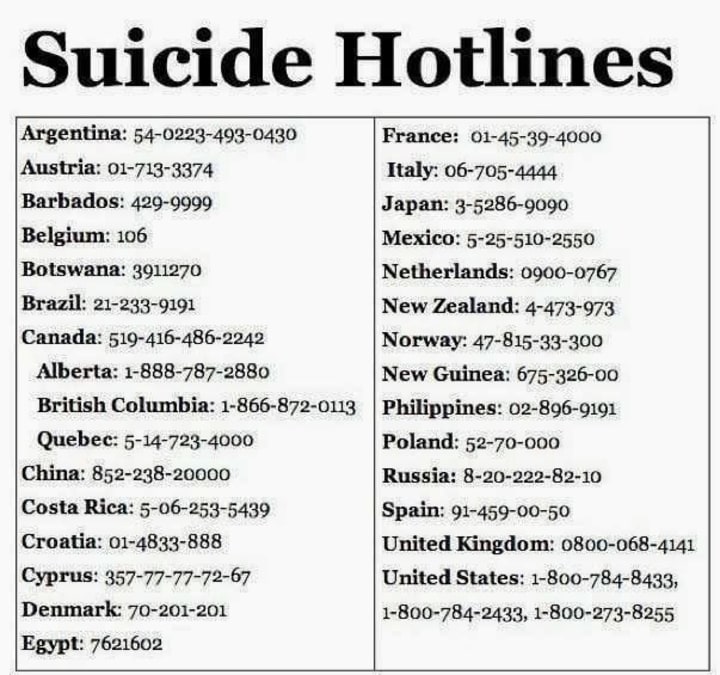 If you or someone you know are suffering from a mental health issue, and are battling suicidal thoughts, you are not alone. Below are all the numbers for the suicide crisis hotlines.