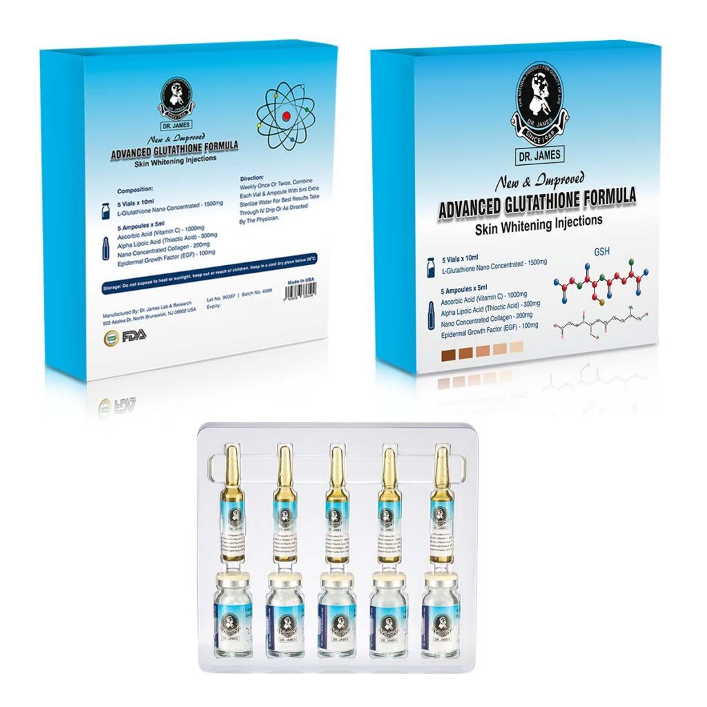 Dr. James Glutathione Injections may be given once or twice every seven days, depending on the doctor's recommendation. The Ampoule Liquid is placed in a vial, which is a tiny container filled with sterile water (5ml). The solution is then delivered by a butterfly syringe or straight IV.