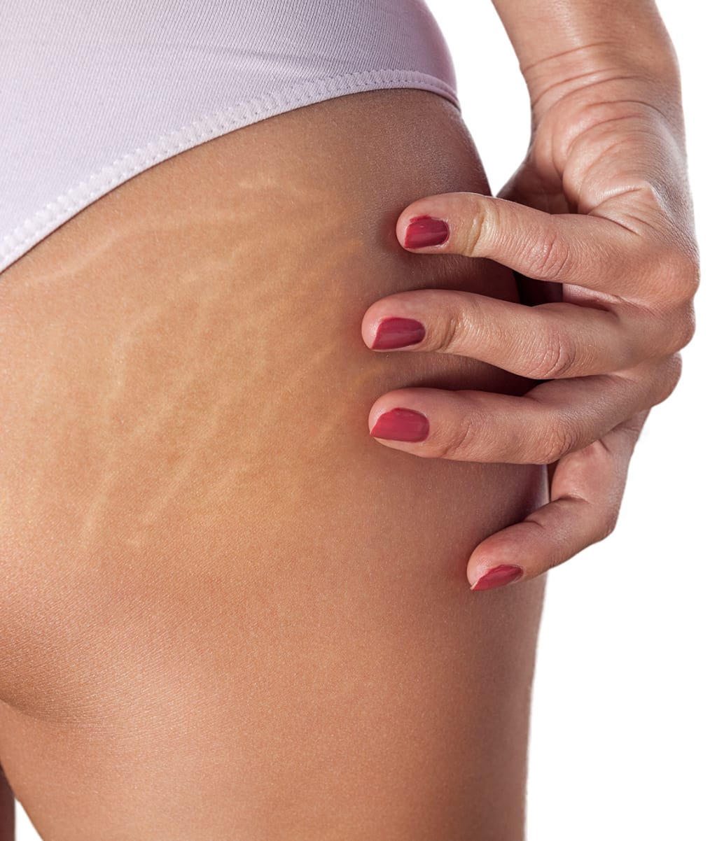 Stretch marks occur when the skin is stretched rapidly, causing the collagen and elastin fibers within the dermis to tear. Initially, these marks may appear as red, purple, or brown streaks, which can fade to a lighter color over time. They can develop on various parts of the body, including the abdomen, thighs, hips, breasts, and arms. Factors contributing to the formation of stretch marks include genetics, hormonal changes, and lifestyle factors such as diet and exercise.