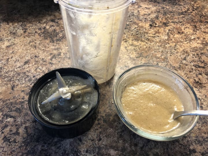 • Add water (or lemon) if the consistency is too thick. Start with a ½ tablespoon and continue to add until you have a consistency of a paste. Make sure it is well blended!