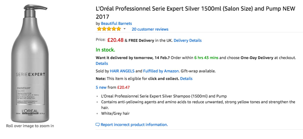 So here I have taken a screen shot down below of this product from Amazon. You can see the full name of the product, how much you can get it for, and what size you can get, too! So this is one of the biggest sizes you can buy; I have this size myself. It should last you about at least a couple of months depending on how many times you're using it. I wouldn't use it every day, again, because this is another very strong product and should really only be used for professional uses. But if you do feel your hair needs some loving, then of course go ahead and use it. But just little by little.